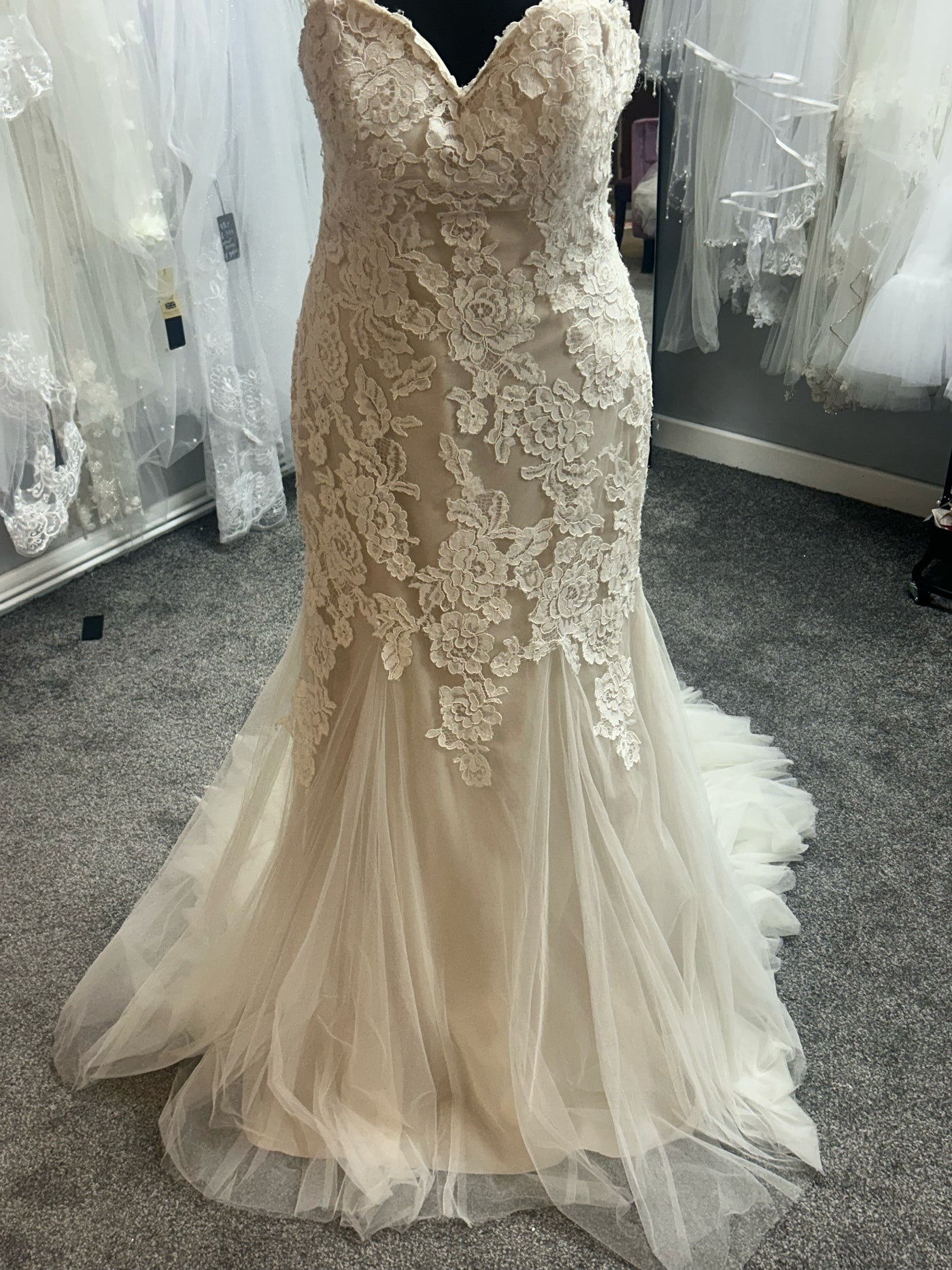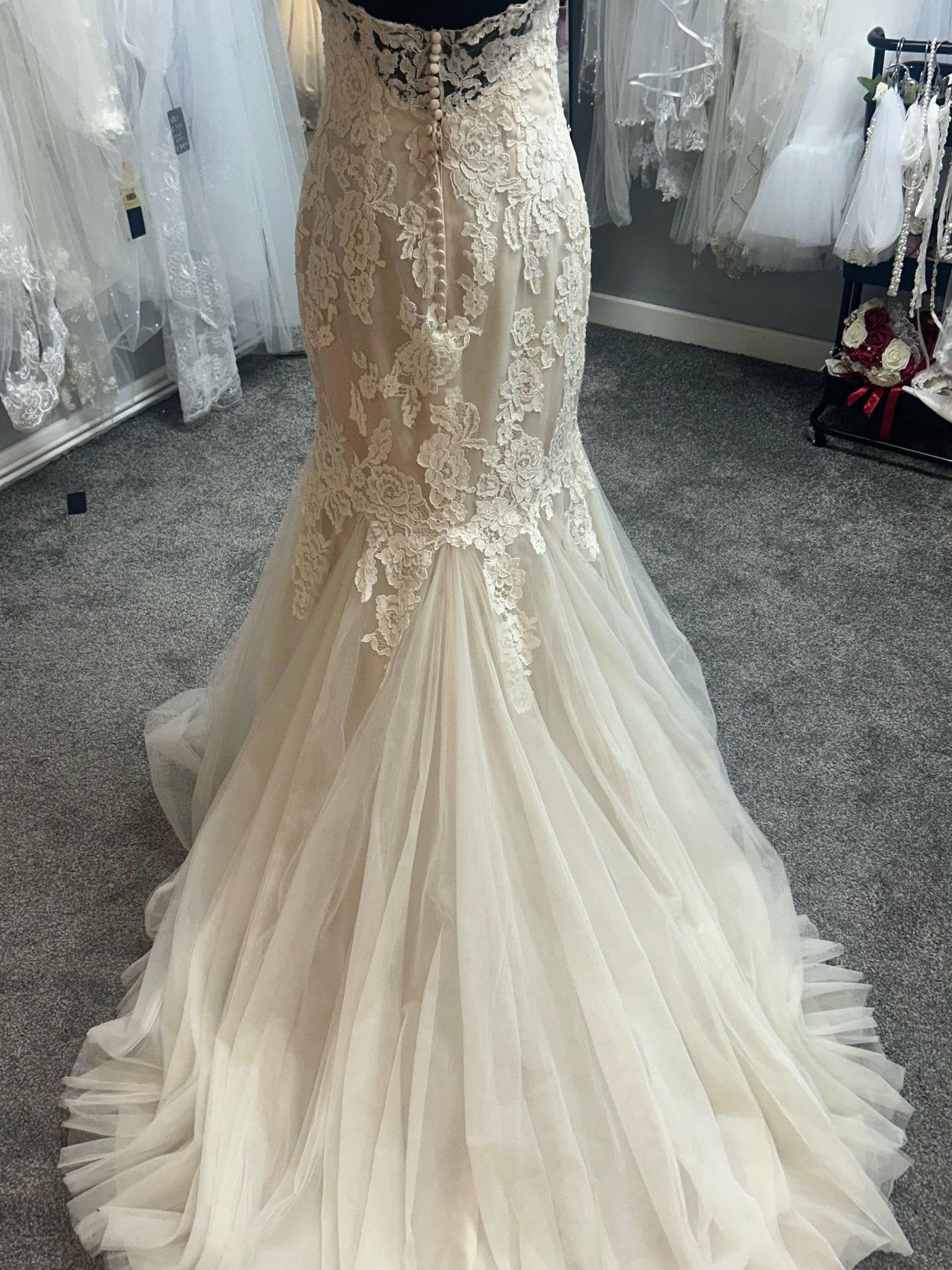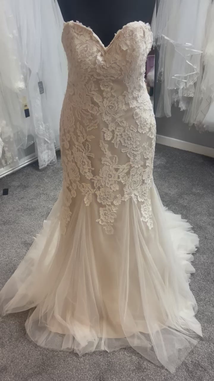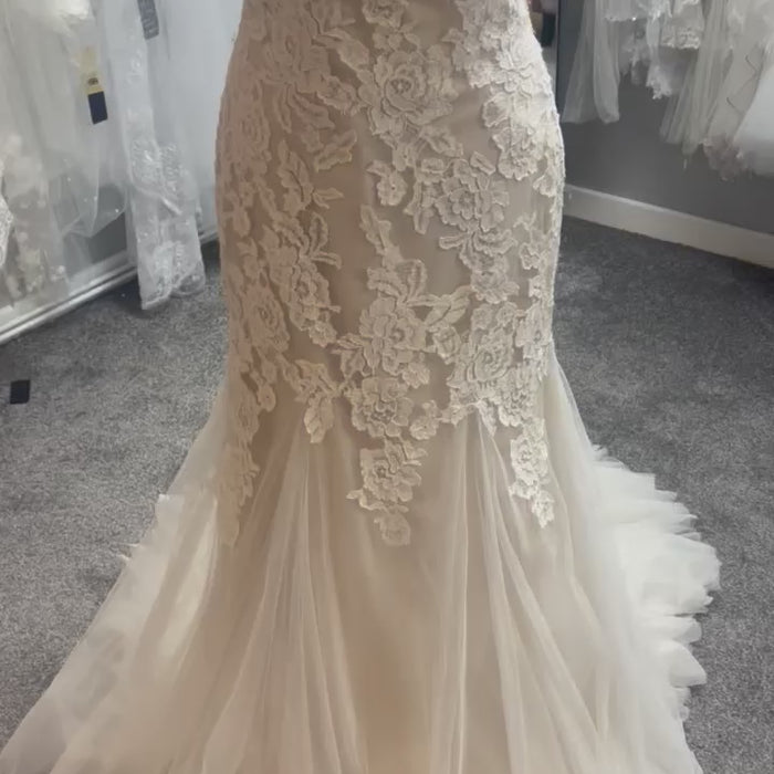 This absolutely stunning gown is a dream come true for brides who want to show off their curves whilst feeling elegant and sophisticated. Nico features a gorgeous strapless sweetheart neckline that beautifully frames your décolletage and creates the most flattering silhouette – it's feminine, classic, and utterly romantic all at once! The entire bodice is adorned with the most exquisite ivory lace appliqués featuring intricate floral designs that cascade down the dress in the most gorgeous organic pattern. Each delicate motif is carefully placed to enhance your natural shape, with the lace flowing seamlessly from the bodice down into the skirt. The warm champagne underlay gives this dress a soft, luminous glow that's incredibly flattering and adds beautiful depth and dimension to all that stunning lacework. What makes Nico truly special is the figure-hugging fit-and-flare silhouette that celebrates every curve before dramatically flaring out at the knees into layers of soft, romantic tulle that create the most beautiful mermaid effect. The chapel train features gorgeous ruffled tulle layers that add movement, volume, and just the right amount of drama as you glide down the aisle. Whether you're planning a chic city wedding, an elegant countryside celebration, or a glamorous ballroom affair, Nico brings that perfect blend of classic Hollywood glamour and contemporary bridal style!
