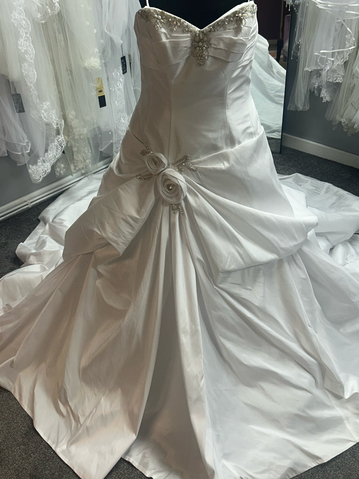 What makes this dress truly extraordinary is the dramatic sculptural skirt that's pure artistry. At the hip, gorgeous handcrafted satin rosettes become the centrepiece of an incredible gathered and draped design. The fabric is artfully pulled and pleated to one side, creating the most stunning asymmetrical effect with deep, sculptural folds that add incredible volume and movement. This unique design element transforms the gown into a true work of wearable art.