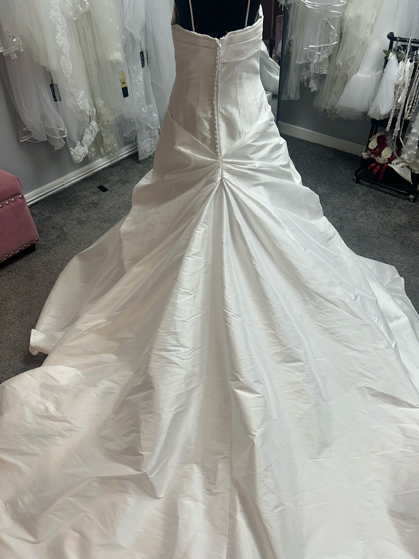 The way the satin is gathered and draped creates beautiful dimension and drama, with the fabric flowing and cascading in organic waves that photograph absolutely stunning from every angle. The voluminous skirt has a romantic, almost ballgown-like quality, with layers of luxurious satin creating that show-stopping entrance you've been dreaming of. The chapel train extends behind you with gorgeous draping and structure, ensuring all eyes are on you.
