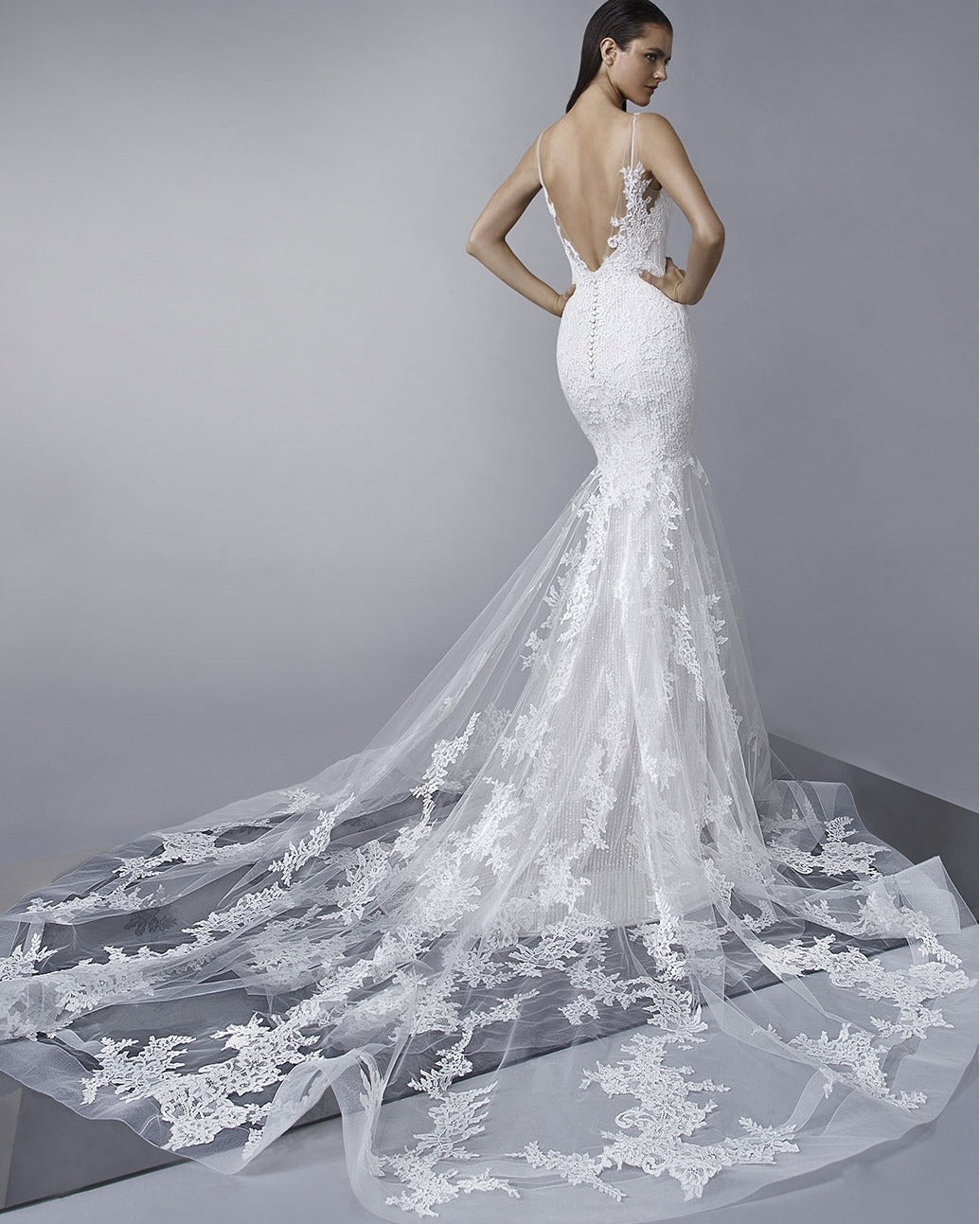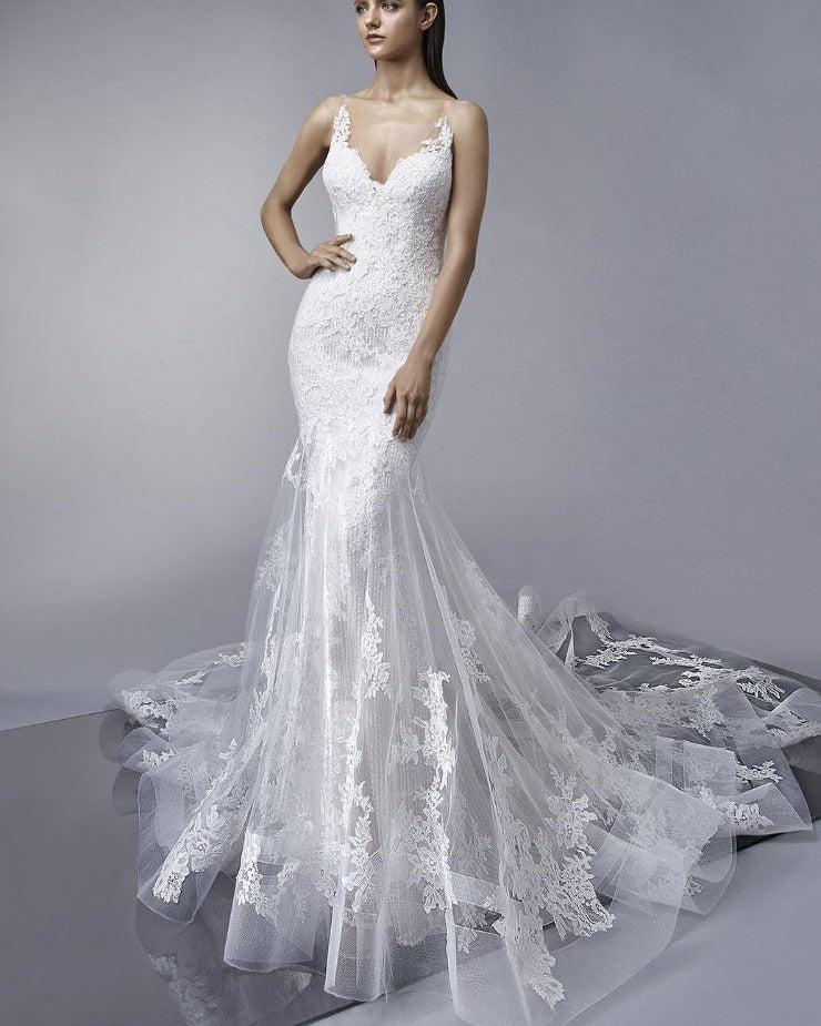 This 2-in-1 gown offers the best of both worlds - the elegance and simplicity of a beaded slip dress underneath, and the drama and romance of a lace shell on top. The deep V-neckline and tulle train add a touch of sophistication, while the delicate covered buttons along the back closure provide a sweet and romantic detail. With this gown, you can easily transition from a daytime wedding to an evening reception without having to change, making it a practical and stunning choice for any bride.