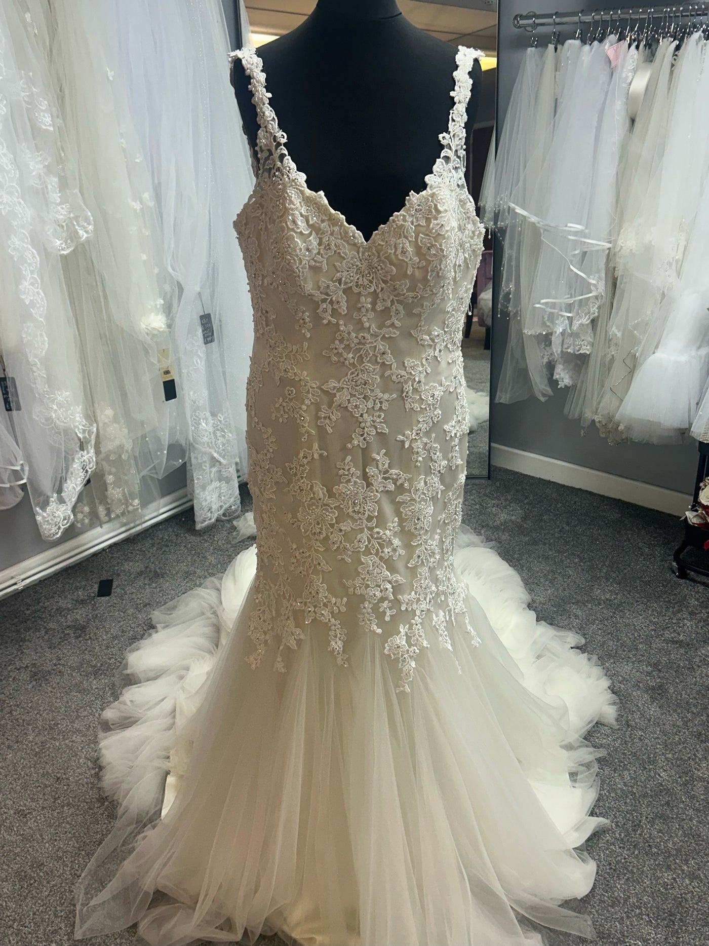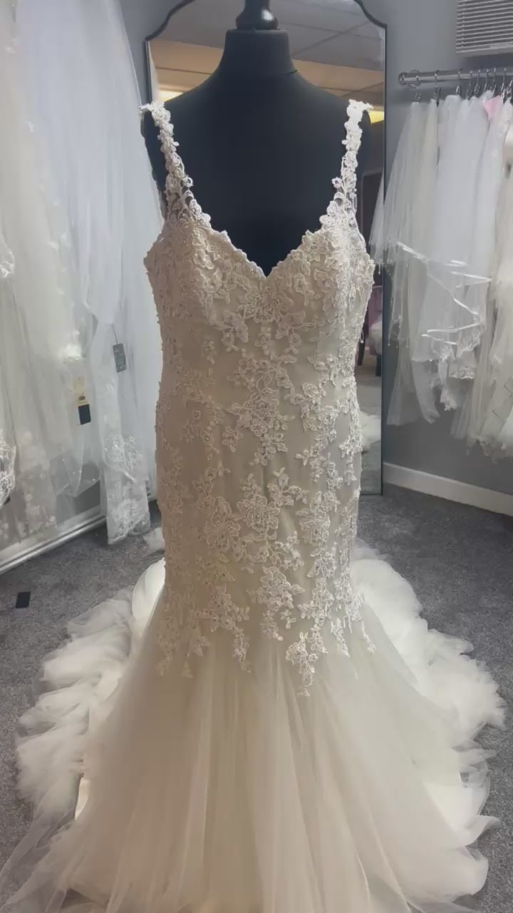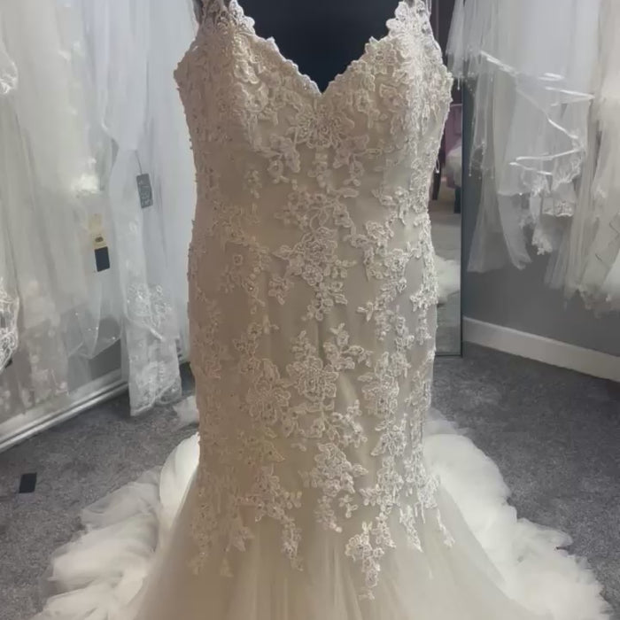 This absolutely breathtaking gown is designed for the bride who wants to make a statement whilst still feeling utterly romantic and feminine. Bennett features gorgeous lace shoulder straps that frame a beautiful V-neckline, creating an elegant and flattering shape that draws the eye exactly where you want it. The bodice is completely covered in the most exquisite ivory lace appliqués with delicate floral motifs and intricate beading that shimmers beautifully in every light – you'll literally sparkle as you walk down the aisle! The soft champagne underlay peeks through the lace, adding warmth and dimension that makes this dress feel luxurious and dimensional rather than flat. What really sets Bennett apart is the stunning fit-and-flare silhouette that hugs your curves beautifully before dramatically flaring out into the most gorgeous ruffled tulle skirt that's equal parts whimsical and sophisticated. Those cascading layers of soft tulle create incredible movement and volume, giving you that show-stopping entrance you've been dreaming of! The chapel train flows behind you like a cloud, adding just the right amount of drama without being too over-the-top. Whether you're planning a glamorous ballroom wedding or a chic garden celebration, Bennett brings that perfect blend of timeless elegance and modern flair that'll have everyone talking about how stunning you looked!
