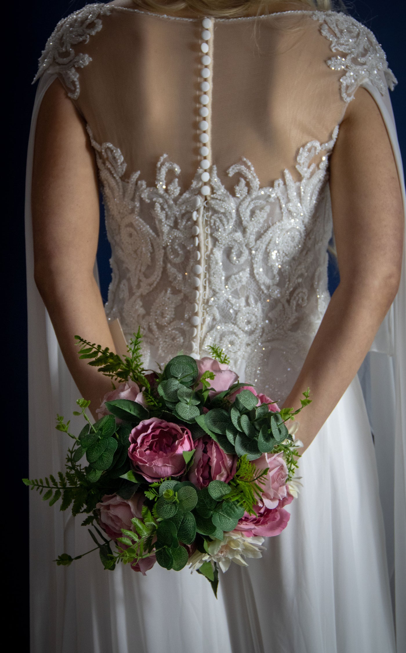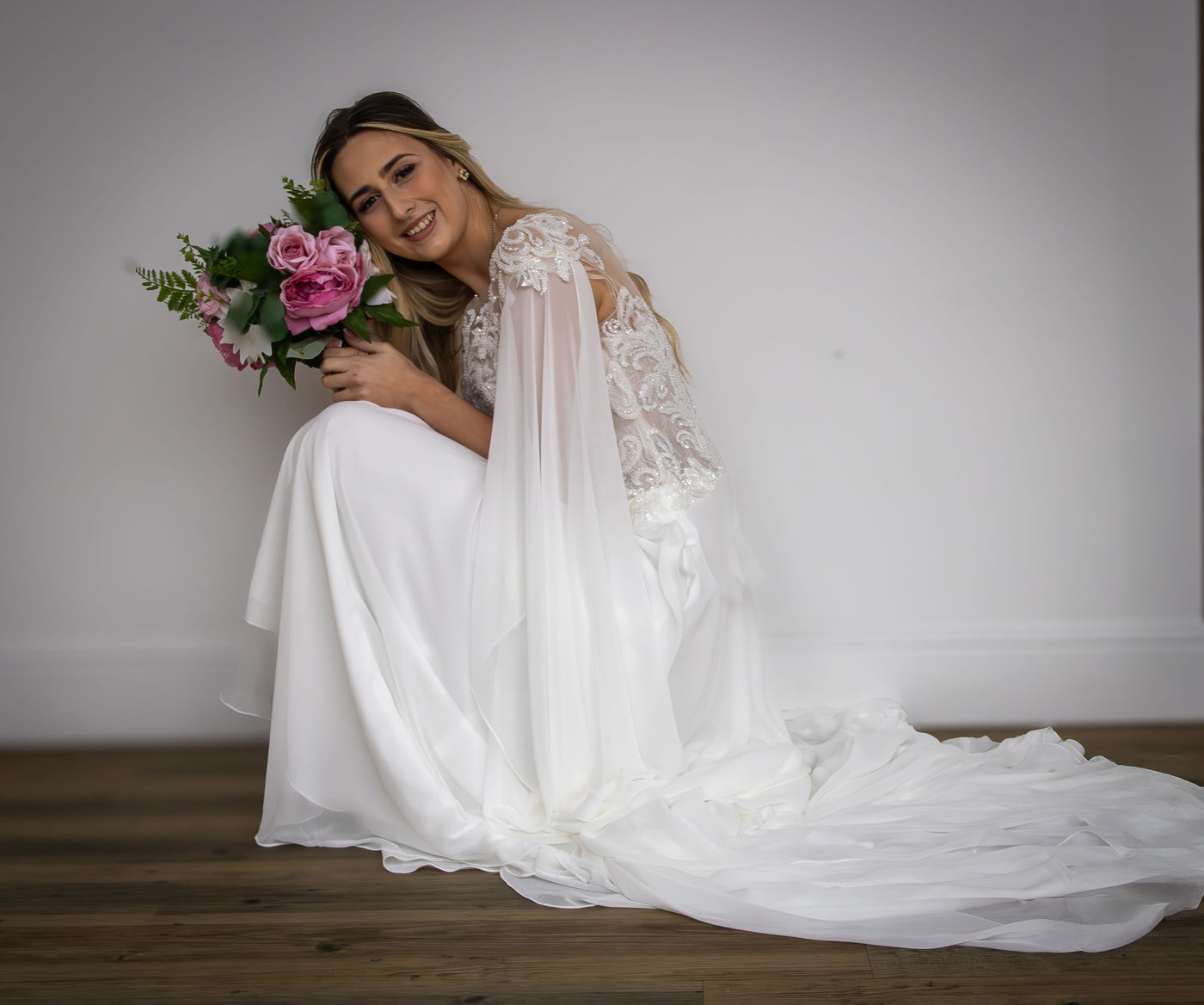 This dramatic yet elegant chiffon wedding dress is a stunning embodiment of bridal sophistication, designed to make a striking statement on your special day. Adorned with exquisite lace accents, the gown features a graceful bateau neckline that adds an air of refinement, while the illusion back detail offers a captivating glimpse of skin, enhancing its romantic appeal. The detachable full-length cape sleeves elegantly cascade from the shoulders, providing an ethereal touch that billows beautifully with every movement, creating a memorable silhouette. This enchanting gown is perfect for the modern bride who seeks a harmonious blend of drama and elegance, ensuring she radiates grace as she walks down the aisle.
