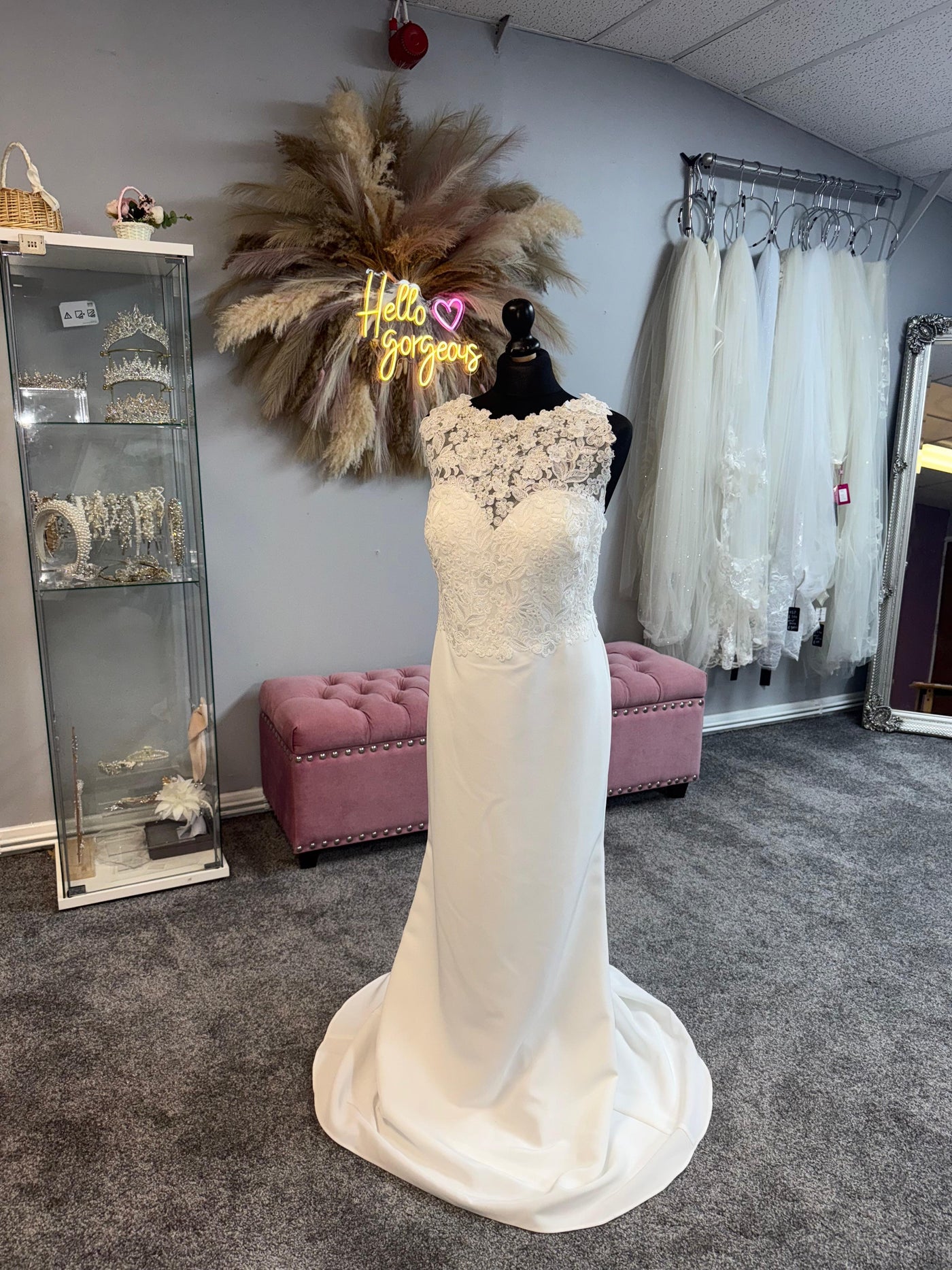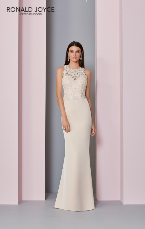 The 29304 gown by Ronald Joyce in UK size 12/14 is a floor-length crepe dress exuding elegance and sophistication. The lace appliquéd bodice creates a stunning focal point, while the bow-detailed keyhole back adds romantic charm and subtle drama. Luxurious crepe fabric flows gracefully, creating a timeless silhouette that flatters every bride beautifully. Exceptional craftsmanship ensures that the intricate lace and bow details look stunning both in person and in photos. Available at Once Upon a Budget in Cwmbran, South Wales, offering designer gowns at remarkable value without compromising style.