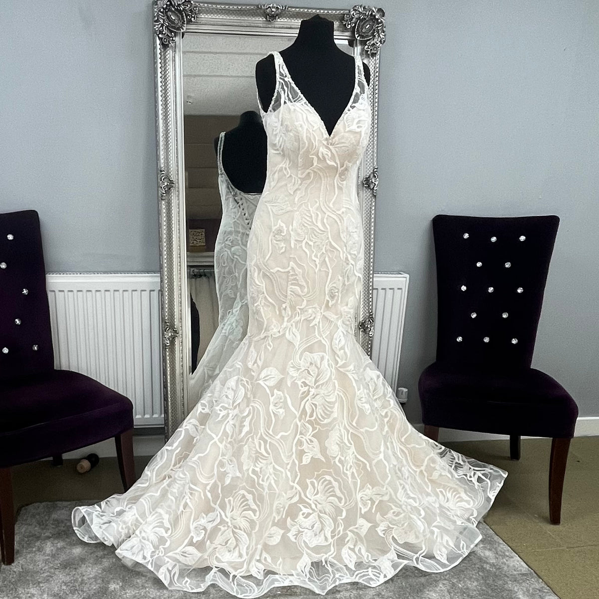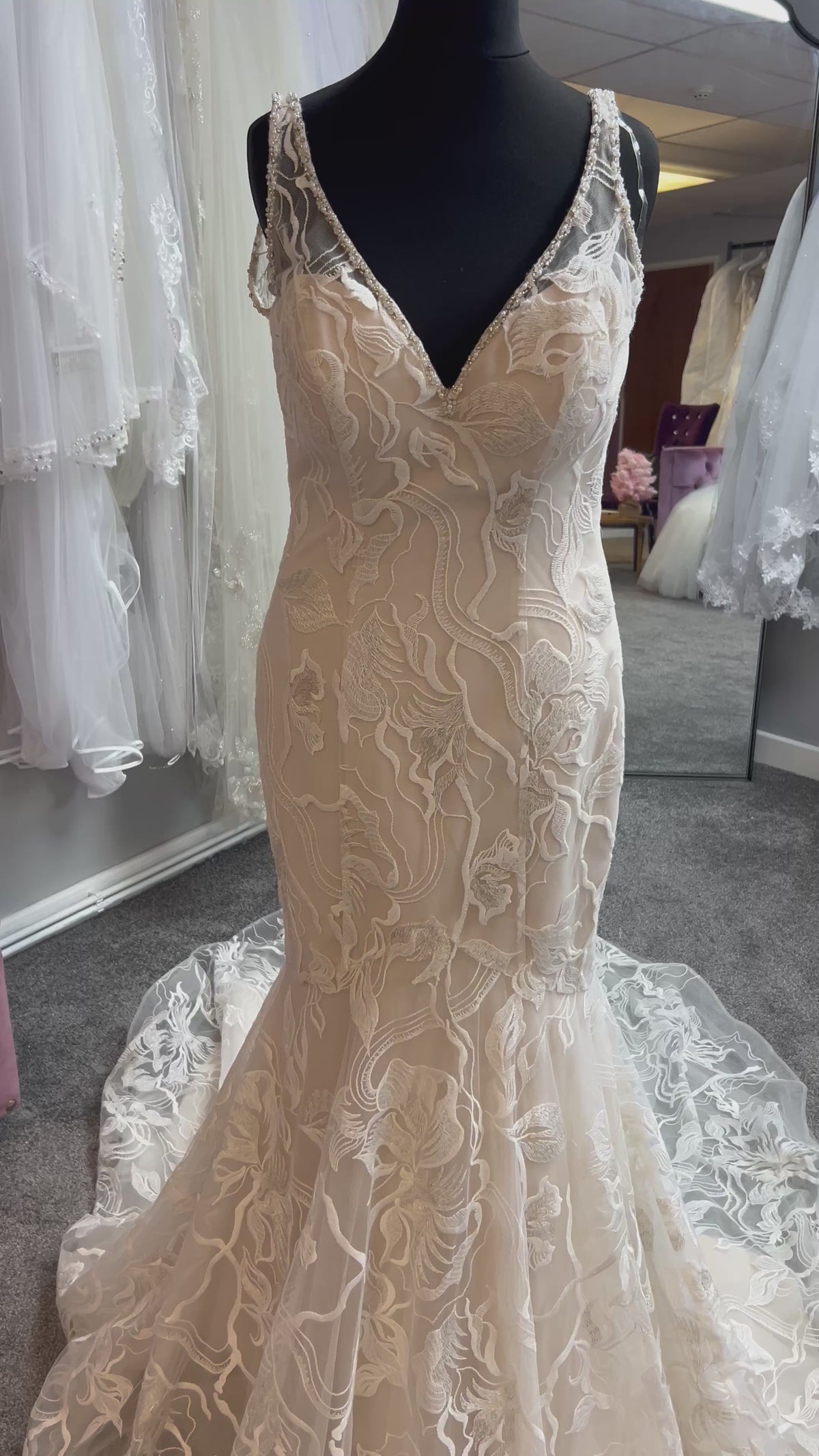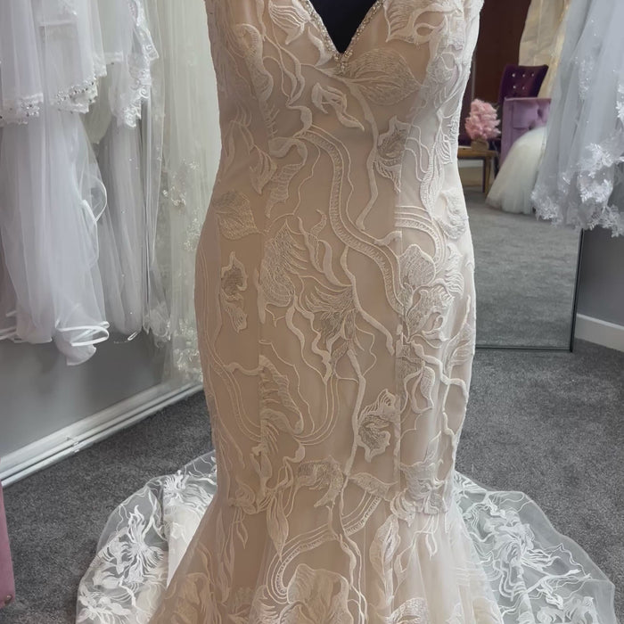 A stunning Nude/Blush Fit and flare gown with gorgeous flower embellishments and a beaded Deep V Neck. Featuring a Corset back to sinch you in and show off your figure. This gown is for those who want to make a dramatic entrance.