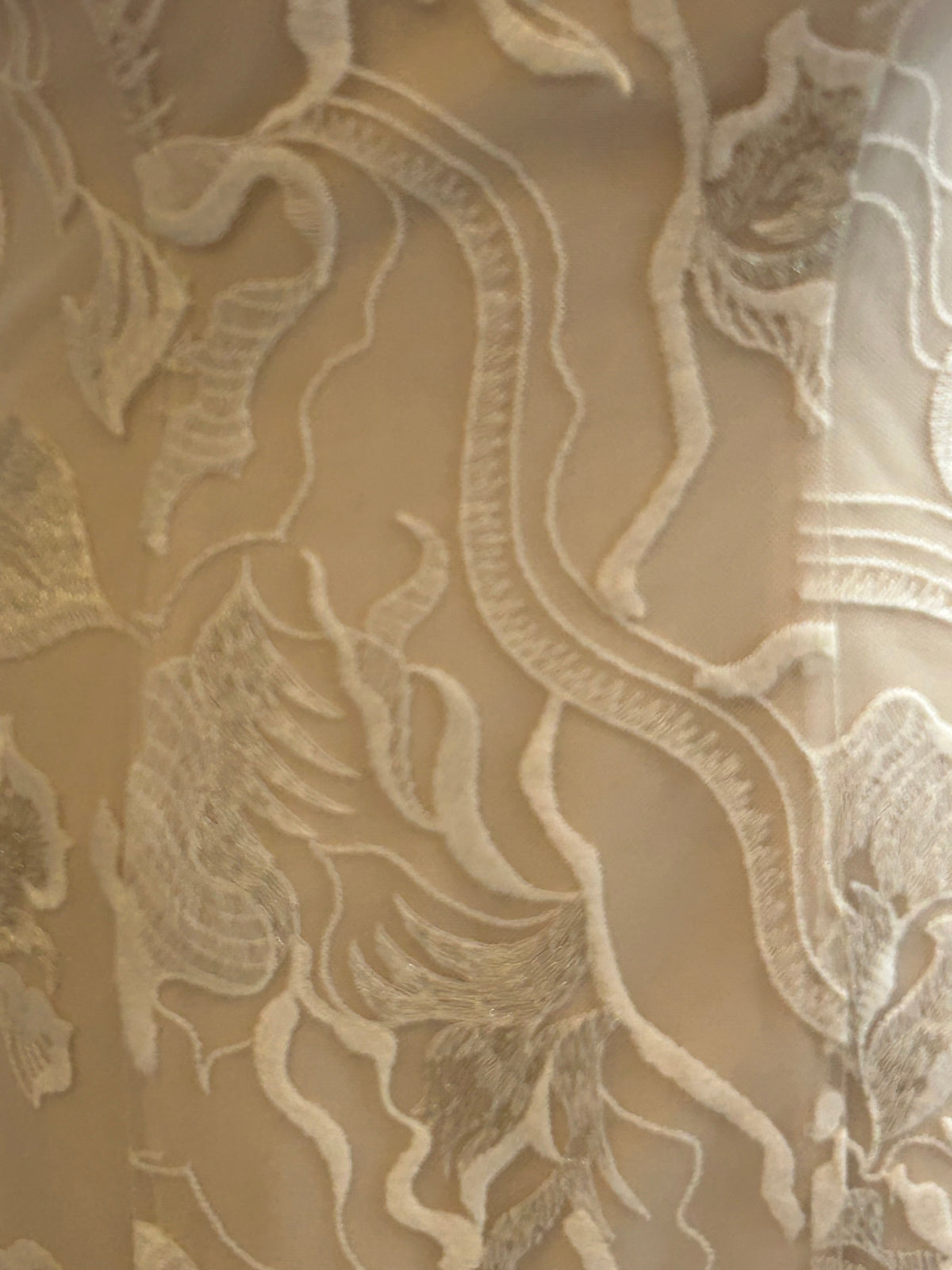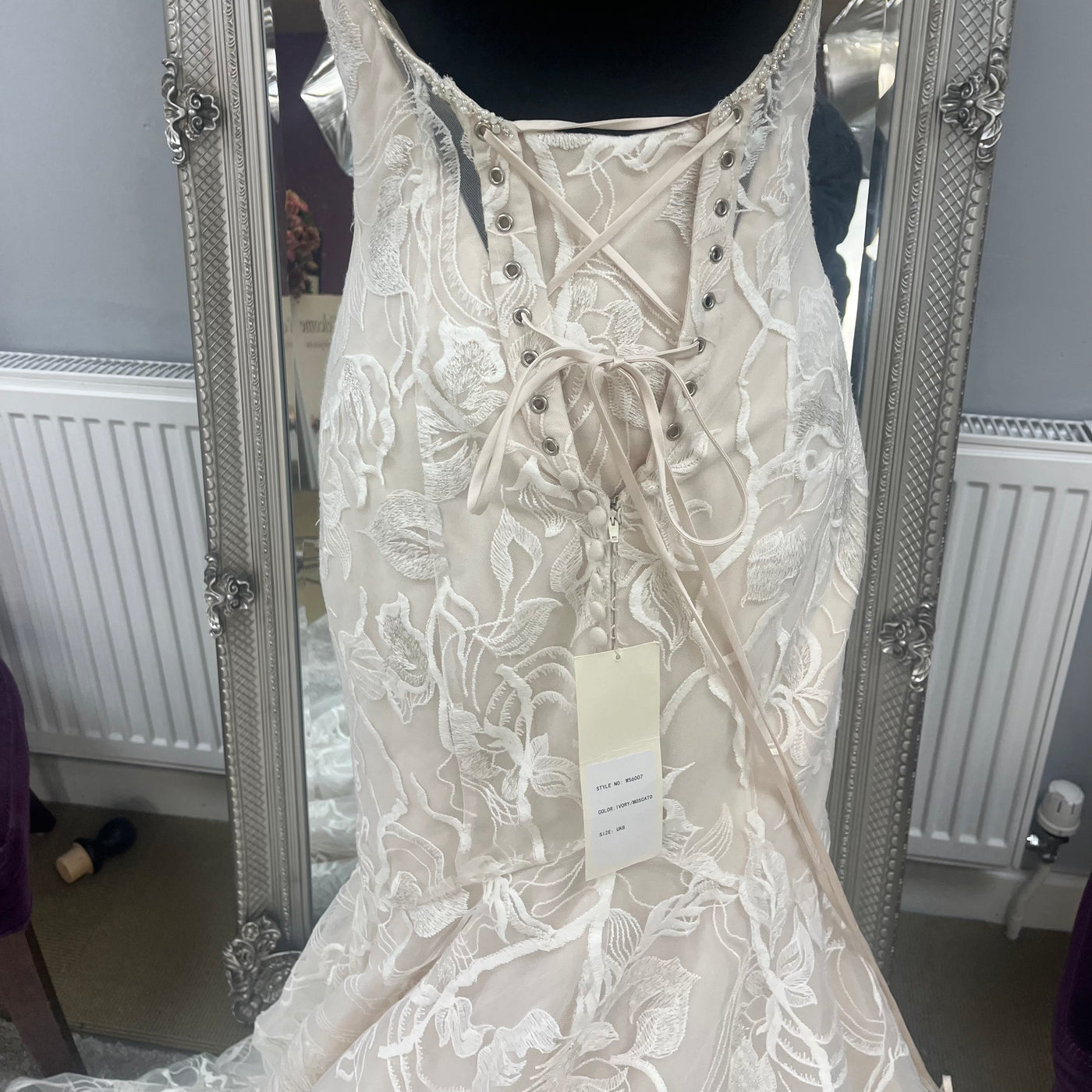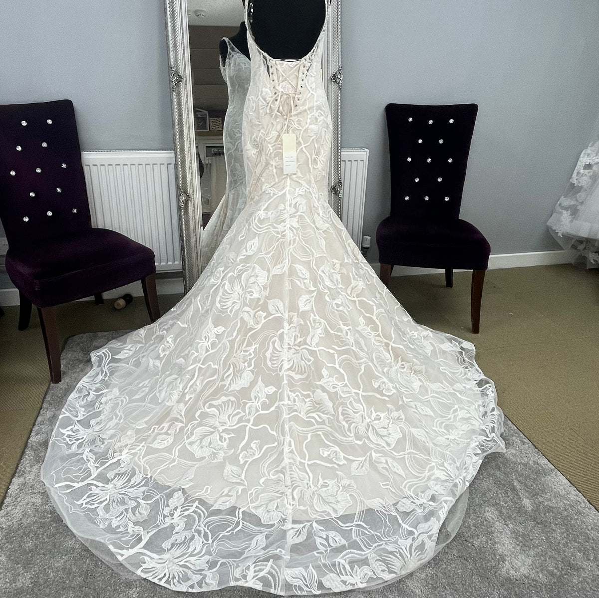 A stunning Nude/Blush Fit and flare gown with gorgeous flower embellishments and a beaded Deep V Neck. Featuring a Corset back to sinch you in and show off your figure. This gown is for those who want to make a dramatic entrance.