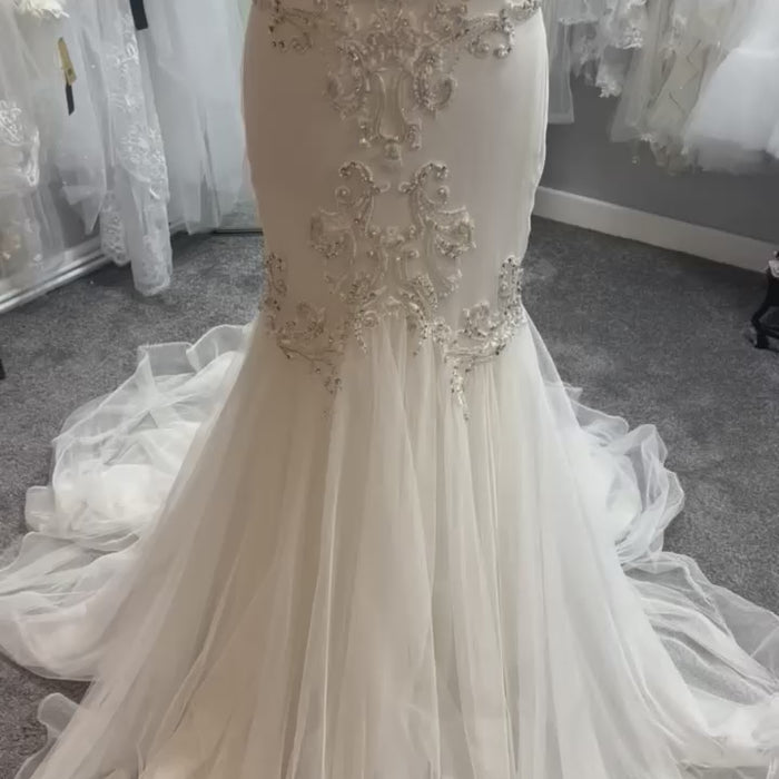 Step into timeless elegance with the Khloe gown by Sottero & Midgley, a breathtaking creation designed for the romantic bride. This stunning UK size 8/10 wedding dress blends delicate detailing with classic sophistication, creating an unforgettable look from every angle.