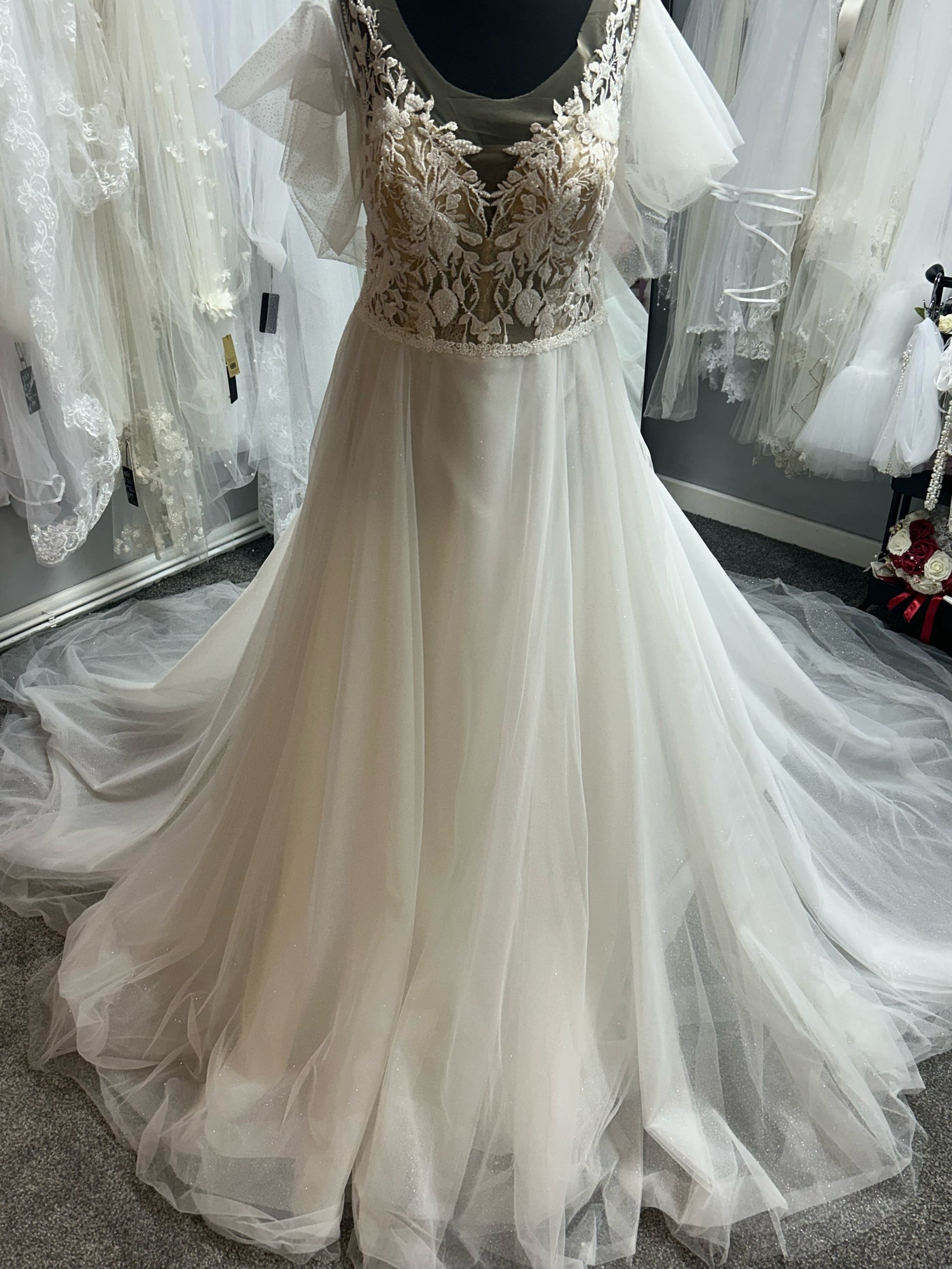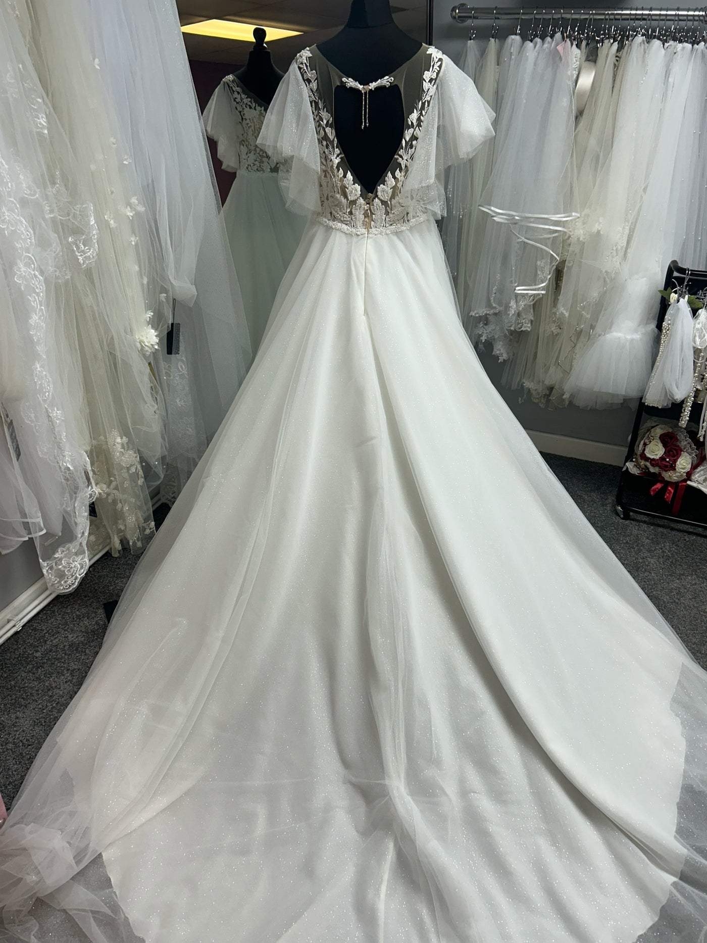 From the natural waistline, the gown flows into the most gorgeous A-line skirt made from layers of soft, flowing tulle that creates effortless movement and volume. The skirt has a subtle sparkle woven throughout the fabric, giving you that magical, glowing effect as you move. The lightweight construction means you'll feel comfortable all day long whilst still having that full, romantic silhouette.