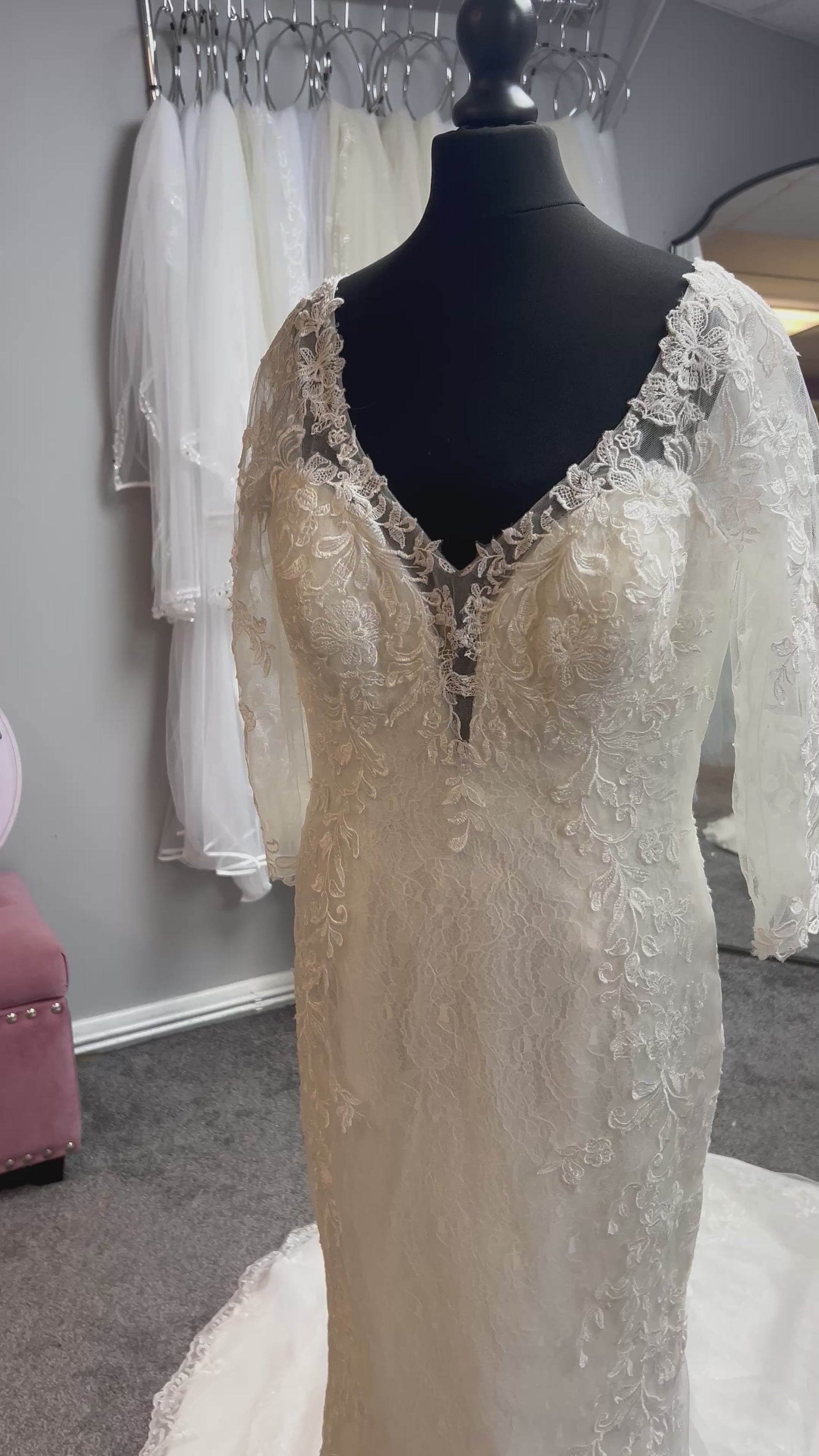 A truly fairytale-like gown! The all-over sequin lace and tulle combination creates a dazzling, ethereal effect, while the trumpet silhouette flatters the figure. The three-quarter sleeves add a touch of modesty, and the sheer back provides a romantic, whimsical touch. The diamante buttons add a hint of glamour, and the chapel train completes the look with drama and grandeur.