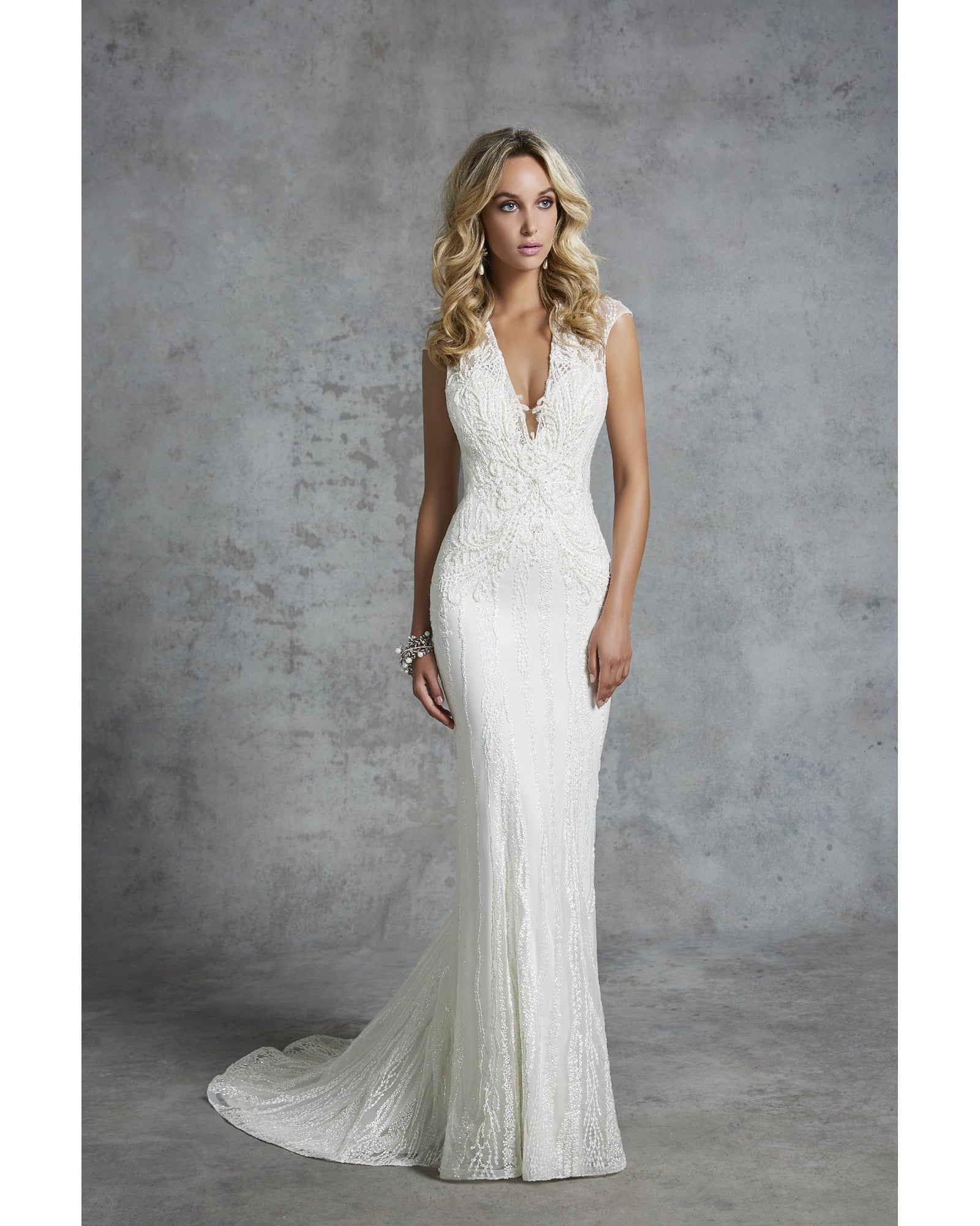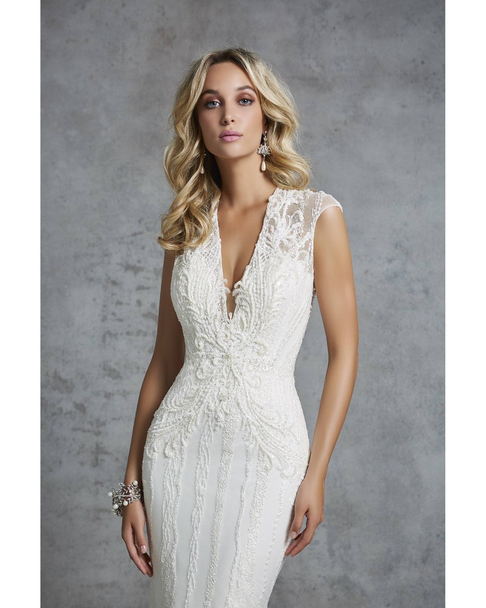 This Fit & Flare low plunging V-Neck dress features a dramatic design with intricate Beading all over the dress, adding a touch of elegance and sophistication. The Cap Sleeve style adds a romantic touch, while the detachable modesty bodice provides an added layer of coverage and versatility. The low plunging V-Neckline creates a stunning focal point, making this dress perfect for a formal occasion or special event.