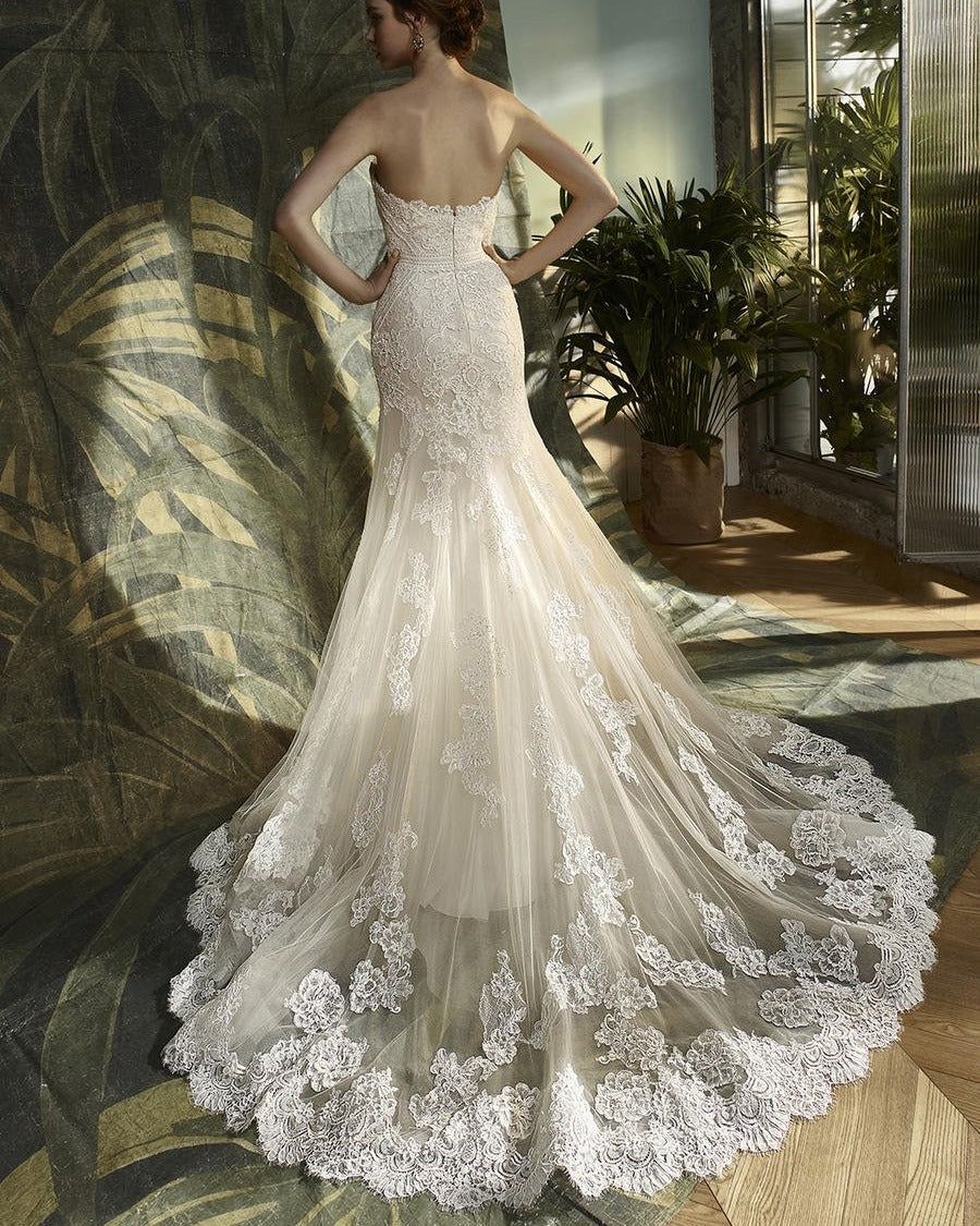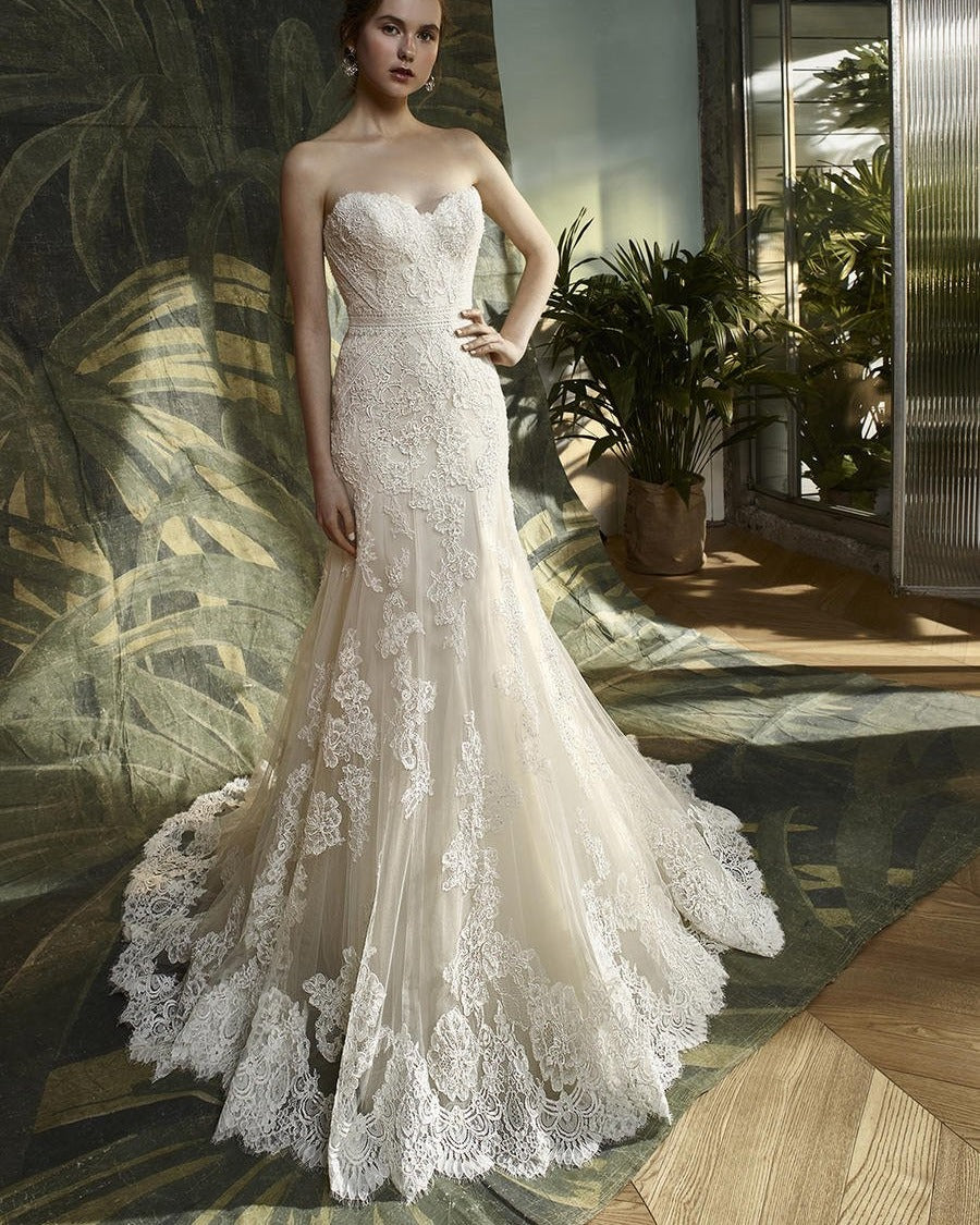This Mermaid gown is a vision in lace! The all-over design on the tulle fabric creates a romantic and whimsical look, while the detachable Cap Sleeves add a touch of elegance and versatility. The Mermaid silhouette hugs the body in all the right places, accentuating the curves, before flaring out in a dramatic train.
