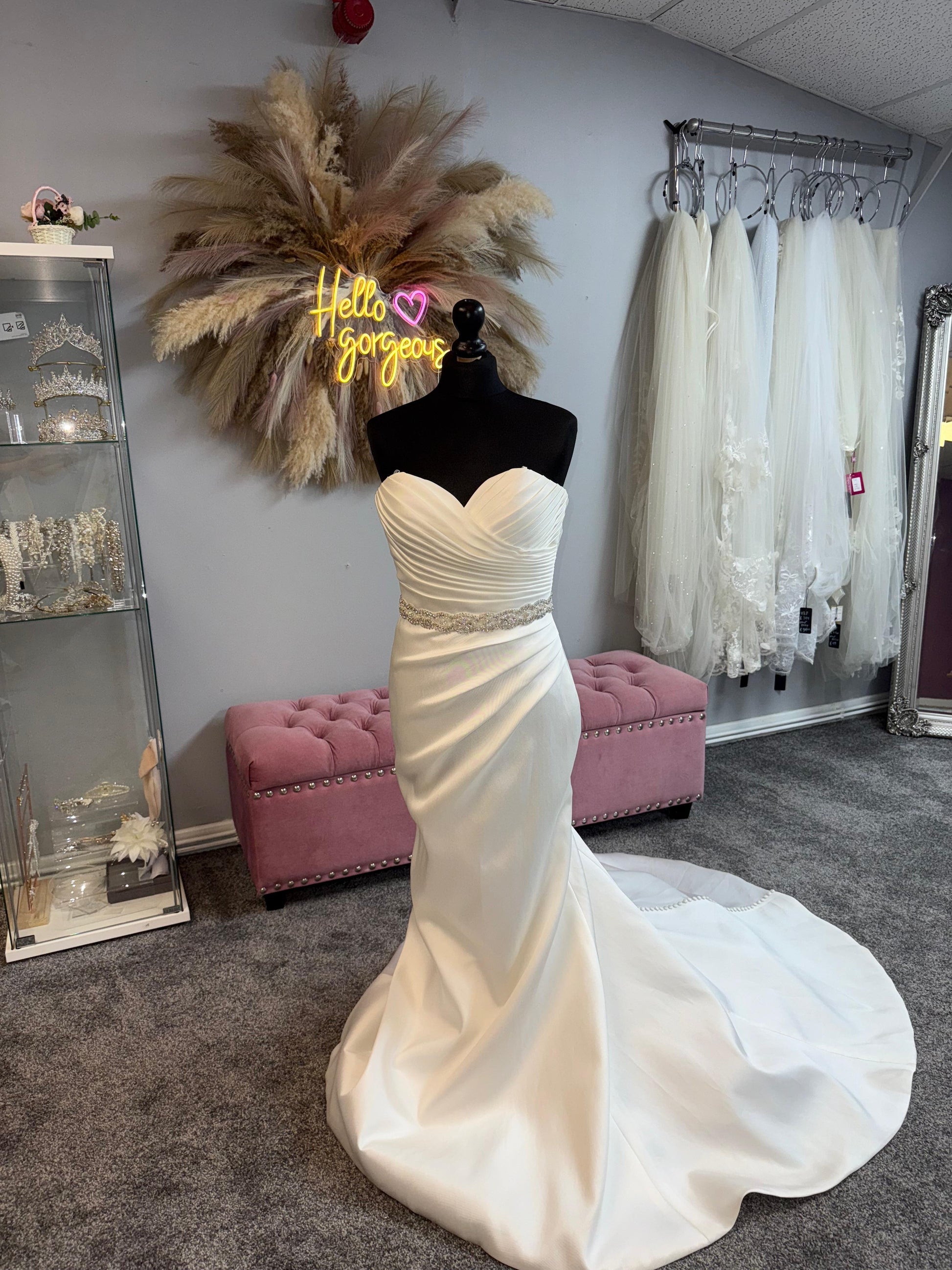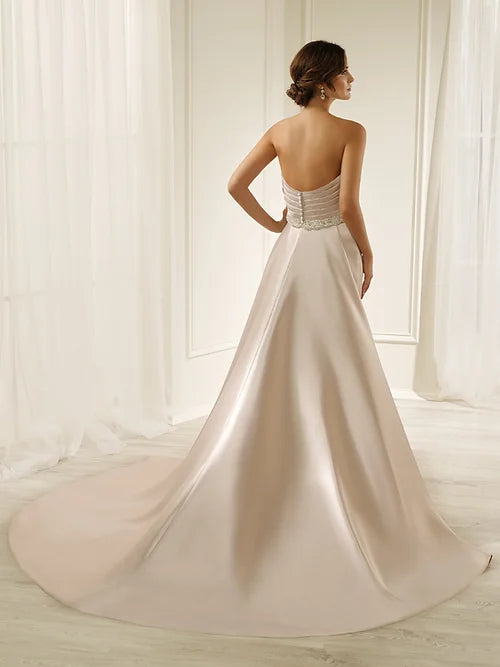 This absolutely stunning strapless mikado fishtail gown is pure sophistication and classic bridal elegance! The gorgeous ruched bodice creates the most flattering silhouette, hugging your curves in all the right places while the luxurious mikado fabric provides structure and support that will have you feeling confident all day long. The sweetheart neckline is universally flattering and perfectly frames your décolletage, while the intricately beaded waistband adds just the right amount of sparkle and glamour to catch the light beautifully.